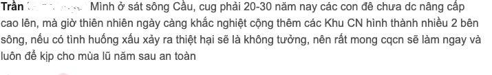 Tuy nhiên, theo đánh giá của chuyên gia Thuỷ lực Môi trường Vũ Thanh Ca, hệ thống đê hạ lưu sông Cầu vẫn còn yếu. Các tuyến đê được đầu tư kiên cố bằng bê tông chỉ ở các khu vực xung yếu, phần lớn còn lại là đê đất, chỉ chờ có lũ tràn lên rồi dùng đê bao gia cố, chắp vá lại.