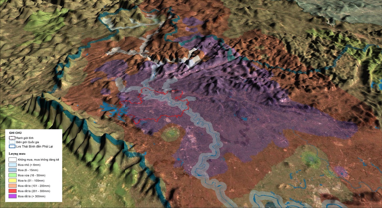 Dựa trên bản đồ lượng mưa của Thái Nguyên, ta có thể nhận ra, mưa không chỉ trút xuống ở vùng lòng chảo đồng bằng mà còn ở quanh triền đồi. Và đúng như suy đoán, “rừng” được trồng trên các đồi núi xung quanh vùng ngập của Thái Nguyên phần đông là rừng keo độc canh, do đó nước cứ mặc sức đổ về đồng bằng, mà không có gì giữ lại.