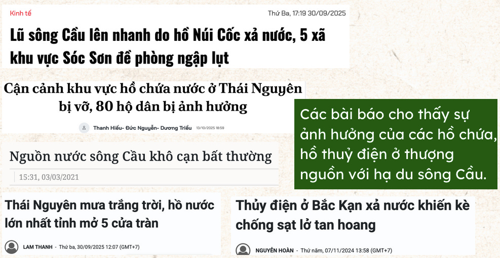 Cộng thêm việc dòng chảy của sông Cầu nhiều năm qua đã bị các hồ chứa làm thay đổi, kéo theo đặc tính như độ rộng hoặc sâu của lòng sông thay đổi bất thường, làm hiệu quả thoát lũ giảm đi.