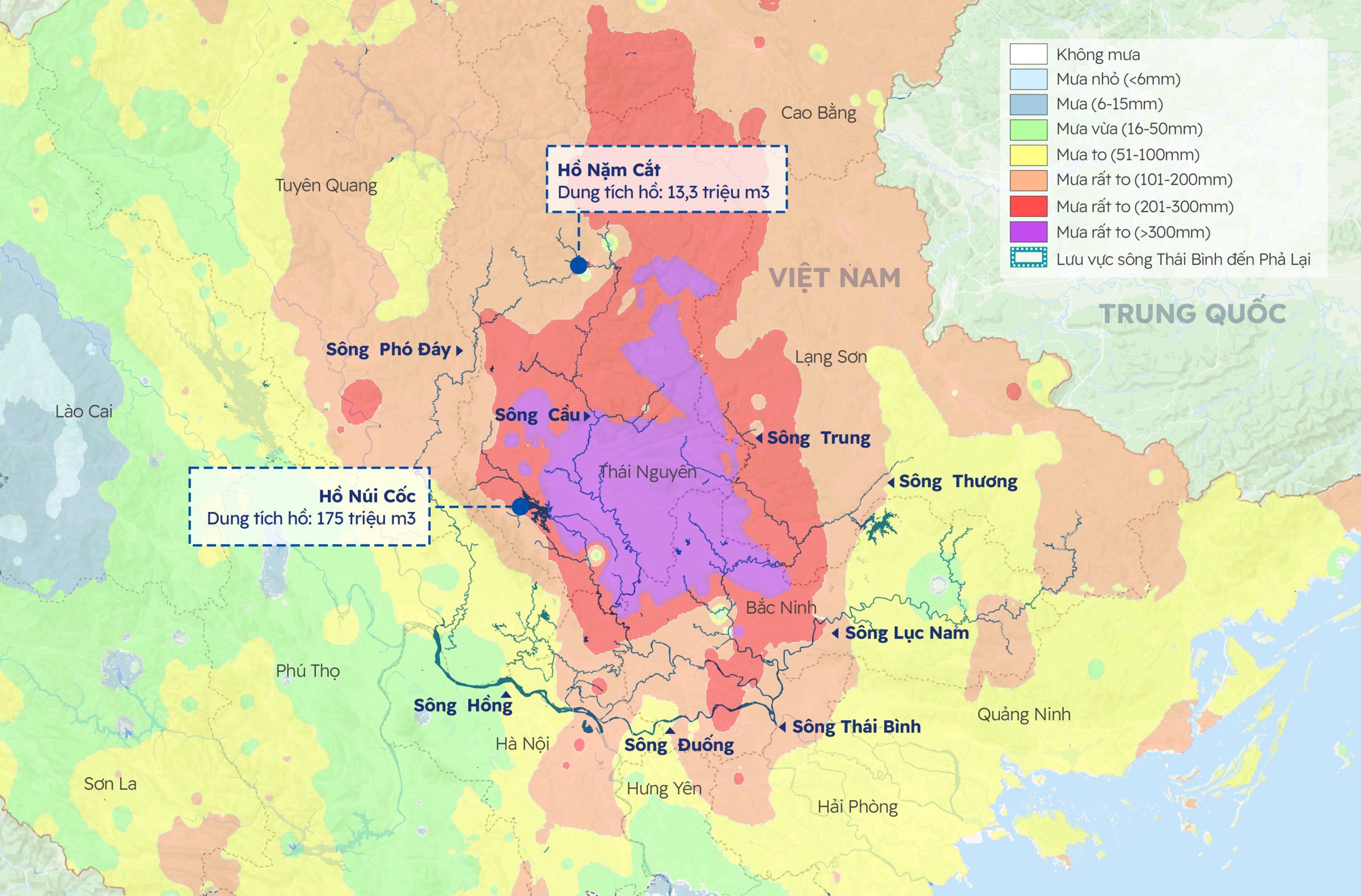 Các khu vực ngập nặng và sâu nhất ở Thái Nguyên chủ yếu là quanh sông Cầu. Sông Cầu là một trong những con sông lớn nhất và dài nhất chảy xuyên qua các tỉnh miền Bắc Việt Nam, đồng thời đóng vai trò quan trọng trong việc điều tiết lũ, thoát nước của toàn khu vực.